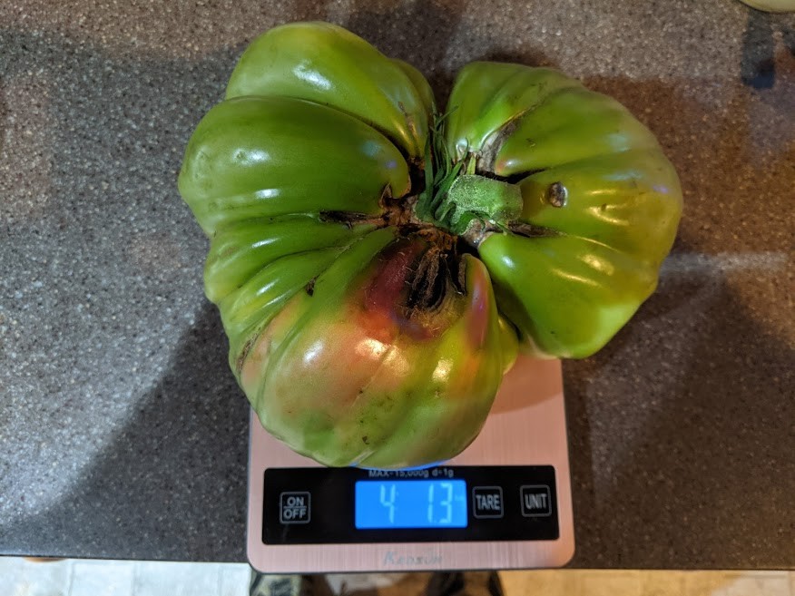 Biggest tomato so far developed a bad spot overnight so time to pick before I lost it altogether. Was still growing at a decent rate at the time. Ended up being pretty light to measure, 24.5" should have been closer to 5 lbs instead of 4. Seed was my 3.52 from last year Big Wixom.