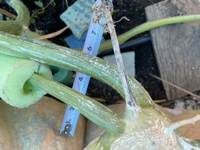 I had placed small bamboo canes abutting the front of the fruit on each side of the stem. Kathy watched the stem & vines while I worked the come-along. As I drew the fruit back, because of the positioning of the tow strap, it actually rotated. The bamboo cane at the upper end of the pic is now 4� from the fruit while the other is only 1.25� away. I had wanted it to rotate slightly but not quite this much. Regardless, we decided that this was good enough & no harm done.