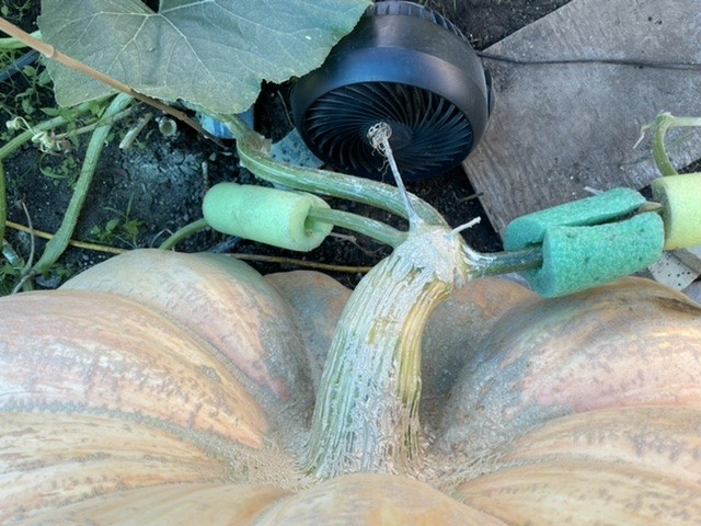 Ever have to do things 2 or 3 times to get them right? Standard fare here. On Sangria I found that the pumpkin shoulder was still quite tight against the distal main vine & I decided that it would be best to address this. So we hooked up the come-along again & moved her, pulling from a slightly different angle. Success! Measuring from the canes I had inserted into the soil abutting the punkin shoulders, we have now moved 4� on the distal main vine side & it is no longer tight. On the proximal main vine side we are out 4.75�. We did get a minor strap burn where the blanket must have slipped out but it is nothing that a little Sulfur powder can�t take care of.