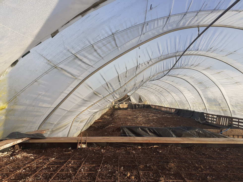Firmly caught by Storm Eunice yesterday, forced the hoops to a convex curve! Whole structure will need to be dismantled and attempt to re-bend hoops to correct profile. Going to delay my patch progress even more....