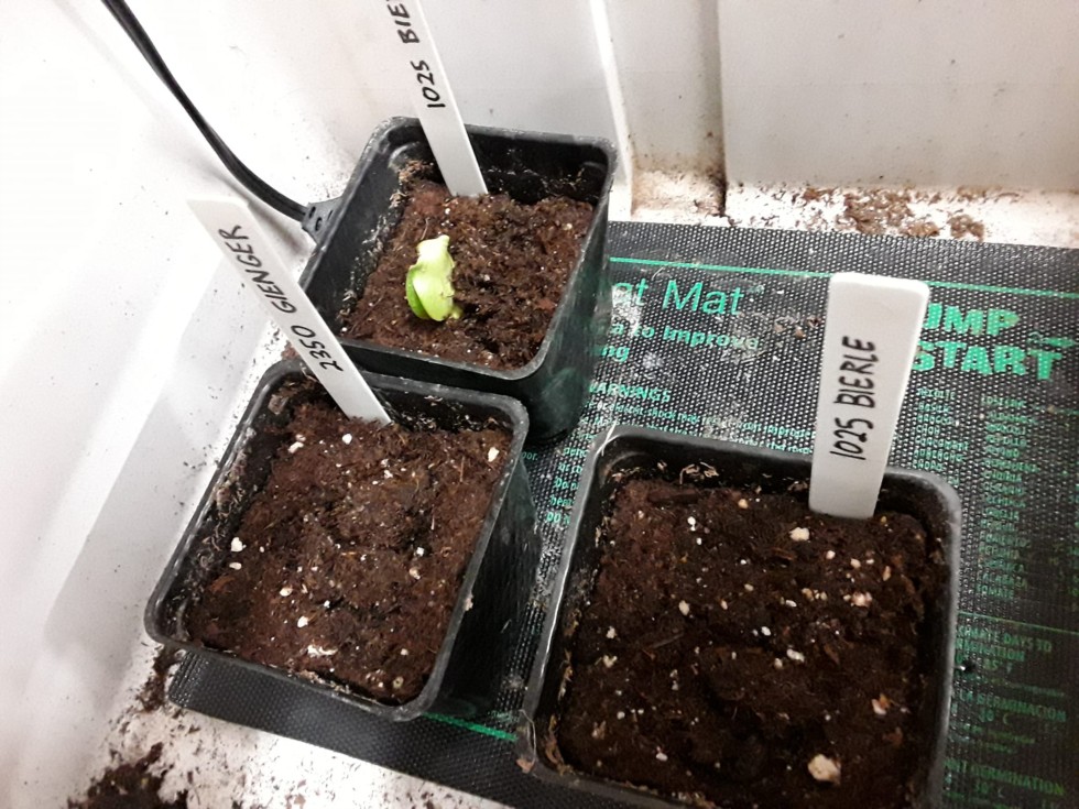 One of the 1025 Bierle seeds is almost out of the soil. The other 1025 and the 2350 Gienger are pushing up the soil and about to break through.