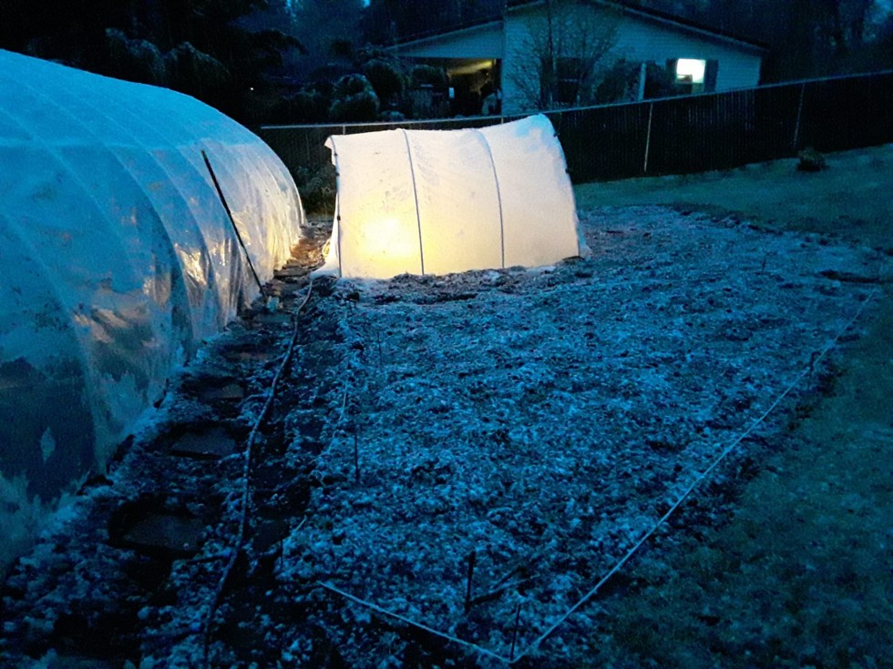 Well..... of all the challenges of pumpkin growing I want expecting snow to be one. I have lived here all of my 43 years and this is the first time that I remember snow accumulation in western Washington in April. It doesn't look like much in this picture but this is our super heavy wet slushy snow. It started while we were gone at church and it collapsed my small hoop house with the 1263.5 Montsma in it. This picture was taken after I propped it back up.