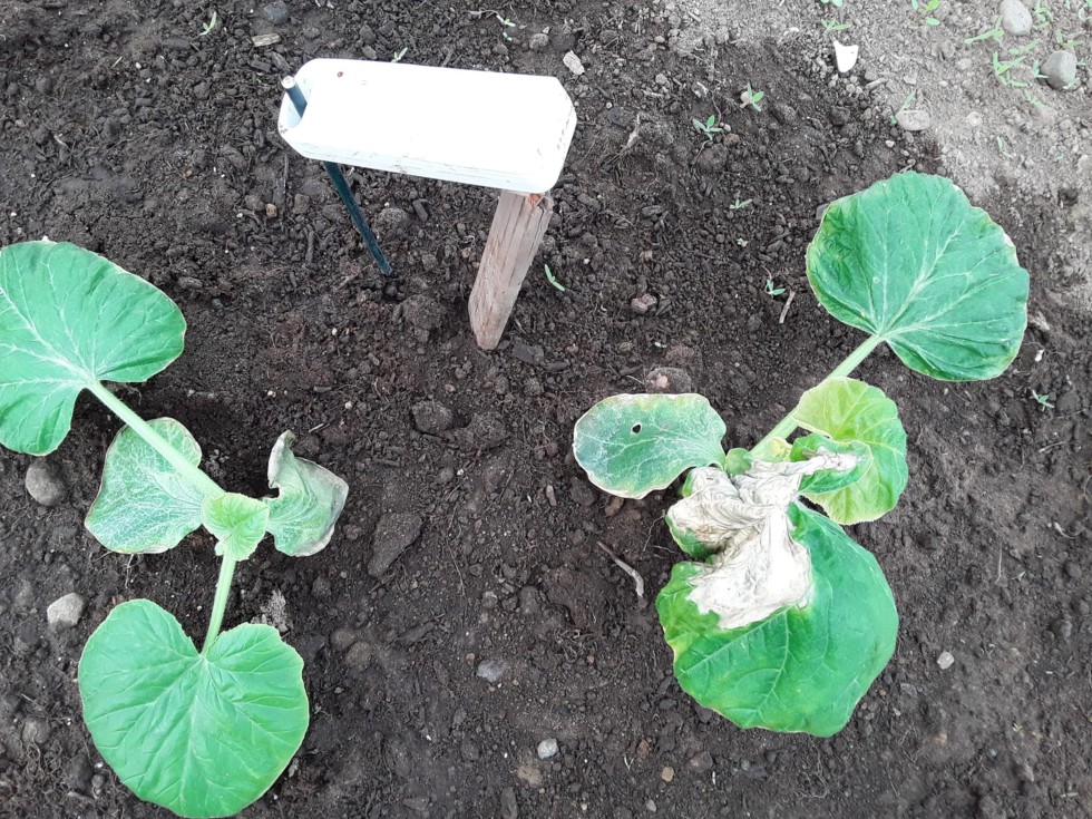 Things went from bad to worse with my 1263.5 Montsmas. After the snow collapsed the hoop house, I used a 2 x 4 to prop it up. Unfortunately when the snow melted it took the tension off the hoop house and the 2 x 4 fell over and landed squarely on the plant that was in better shape, breaking it off at the stem in the process. My backup was still in the house so I pulled the broken plant and replaced it. I am hopeful that the burned plant on the right will pull through. If not, I will have to go with the smaller back up plant on the left. Not a great start to the season at all.