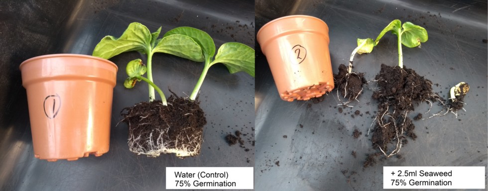 1. Control (10ml Water) � 75% Germination 2. 2.5ml Seaweed Solution + 10ml water � 75% Germination
