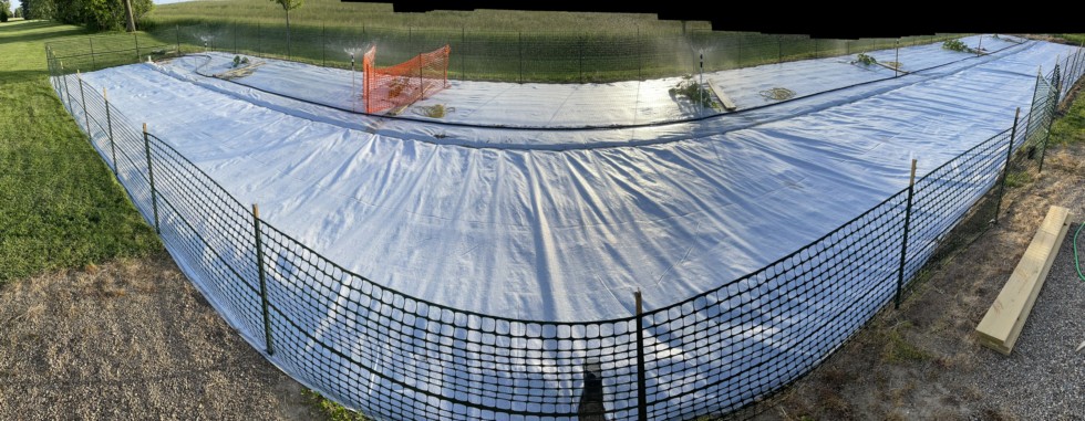 Busy day, I removed hoops, heaters, thermostats, extension cords, etc. I ran the waterlines and Wobblers, tilled the second half of patch and finished installing weed mat. Also put up snow fencing around the front and sides of patch to close it in for a wind break mostly.
