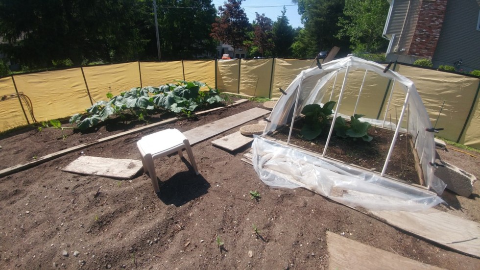 More hot May weather. We just hit 91F and climbing. The only plants enjoying the heat are the 286 Connolly Bushel Gourds. I'm on leaf scorch alert for all the pumpkin plants. Those little plastic tables save any Giant Pumpkin leaves that show signs of high heat scorching lie the leaves shown on the 1552 Young plant. Added shade as a precautionary measure for the BG's.