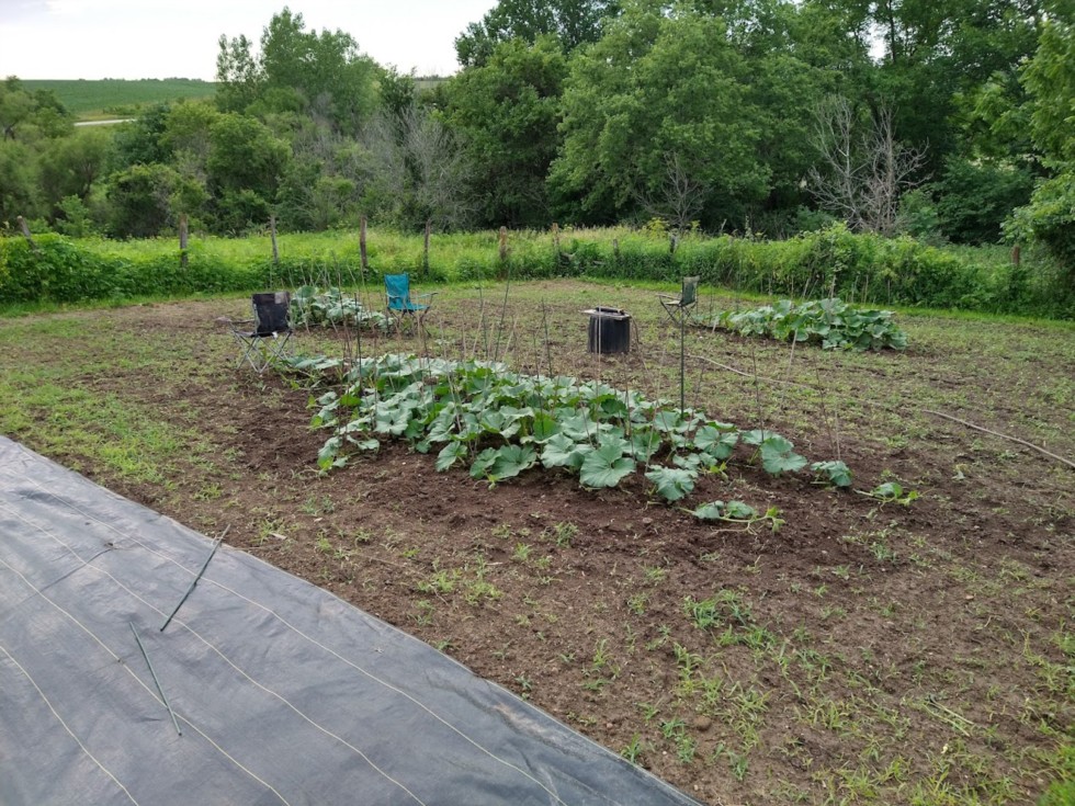 705.5 Still the biggest plant in the patch. Trying to train the vines back behind the stump this year. So far prefer it to the traditional Christmas tree pattern. If you start at the pack gives you more room to work as you move from vine to vine. Looks like the first pollination on it will be in a few days when were gone on vacation. Son will be on pollination duty while we are away. 2118 and 1701 still looking good as well.