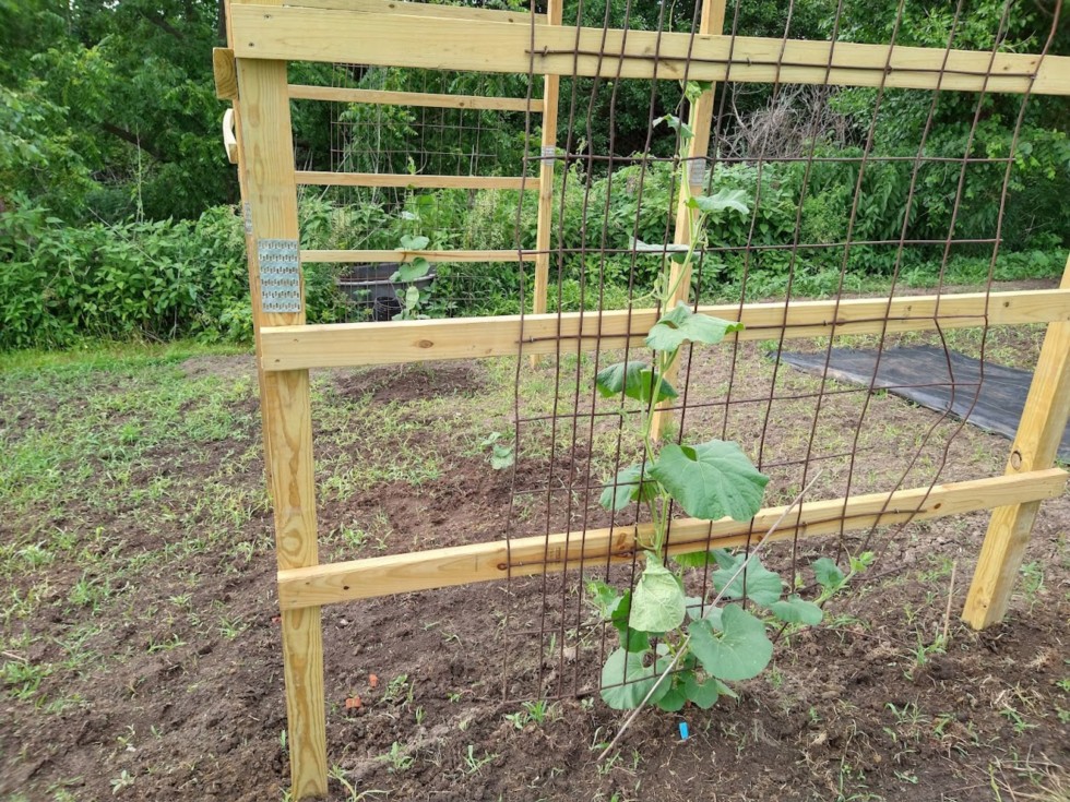 Long gourds starting to make their way up the new trellis