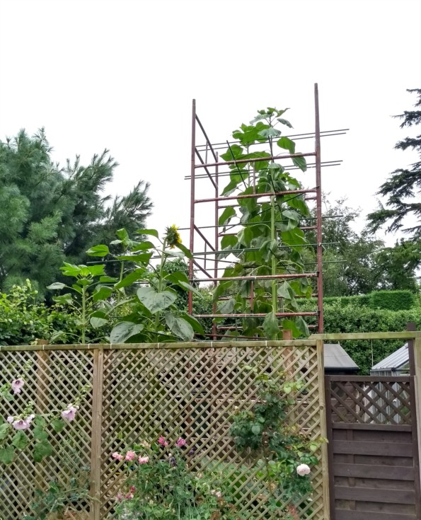 The Sunflower patch at 89 days after germination In just two days of hot weather over Monday (37 �C) and Tuesday (36 �C), the yellows produced +50% of their weekly growth total, with an increment of 30cm for each of the Brown plants over this short period, sadly the lower temps from Wednesday onwards (23 �C to 20 �C) resulted in only a modest weekly gain overall. July 17th to July 24th... - Brown 'A': 468cm (+58cm) - Brown 'B' 440cm (+55cm) - Seed 'B': 380cm (+50cm)