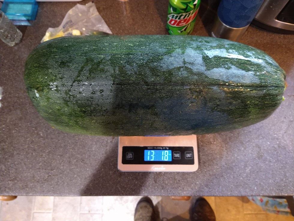 Cull from the Clayton giant zucchini plant, little over 13 lbs. When cut open cavity was hollow not solid like a normal zuke so looks like this one was crossed with something else.