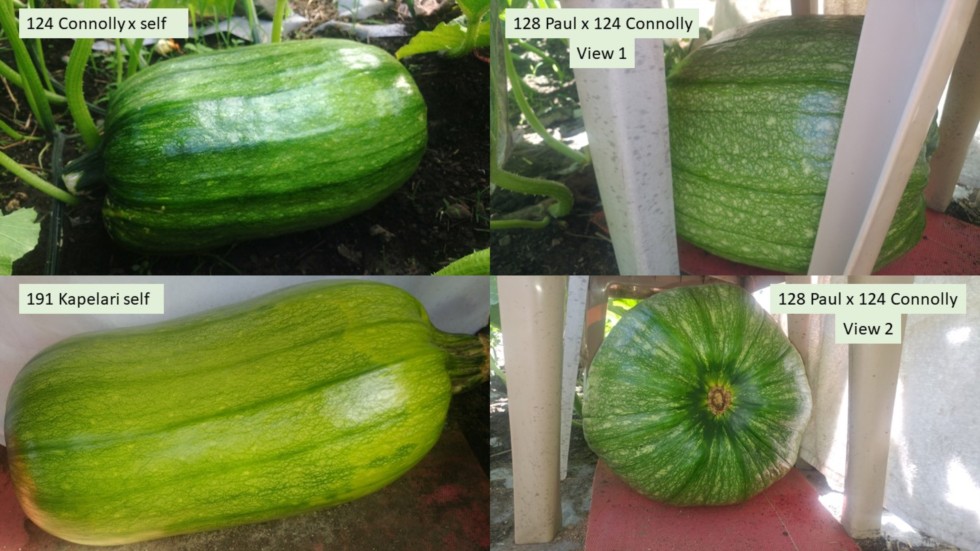 We have 3 Field Pumpkin plants growing this year. All the keepers were pollinated on August 3rd. Shown are the 191 Kapelari x self, 124 Connolly x self, 128 Paul x 124 Connolly