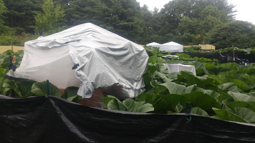 FINALLY, after almost 1 a month drought, we got some rain. No sheets on the giants today, just these homemade contraptions with plastic sheets to keep these fruits dry