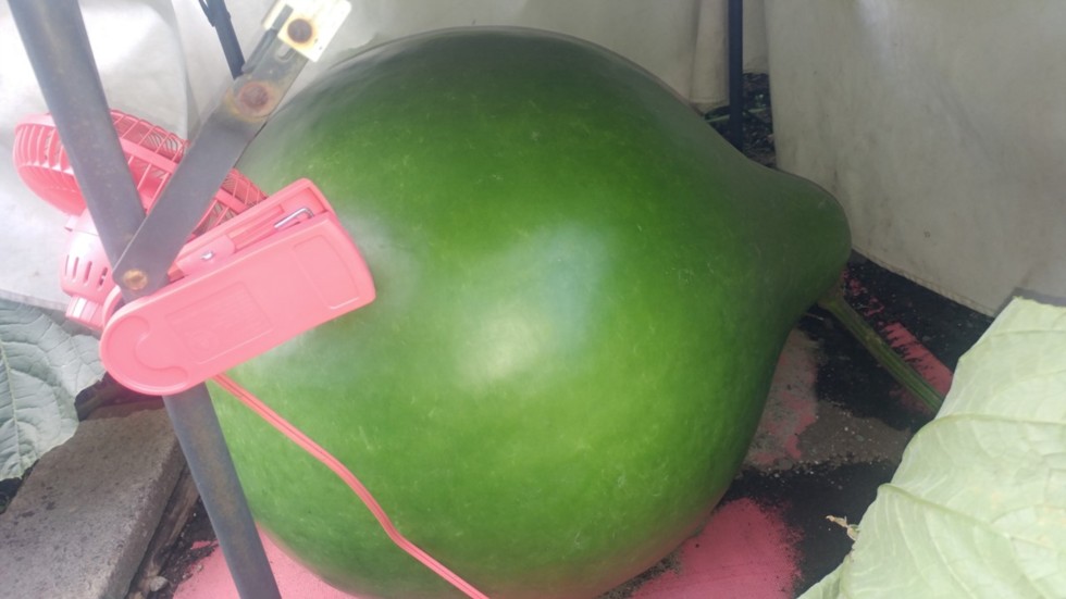 Our 286 x 286 Connolly Bushel Gourd is healthy. By the chart her estimated weight is 205 lbs. and she's put on 6 lbs./day for the last 10 days.