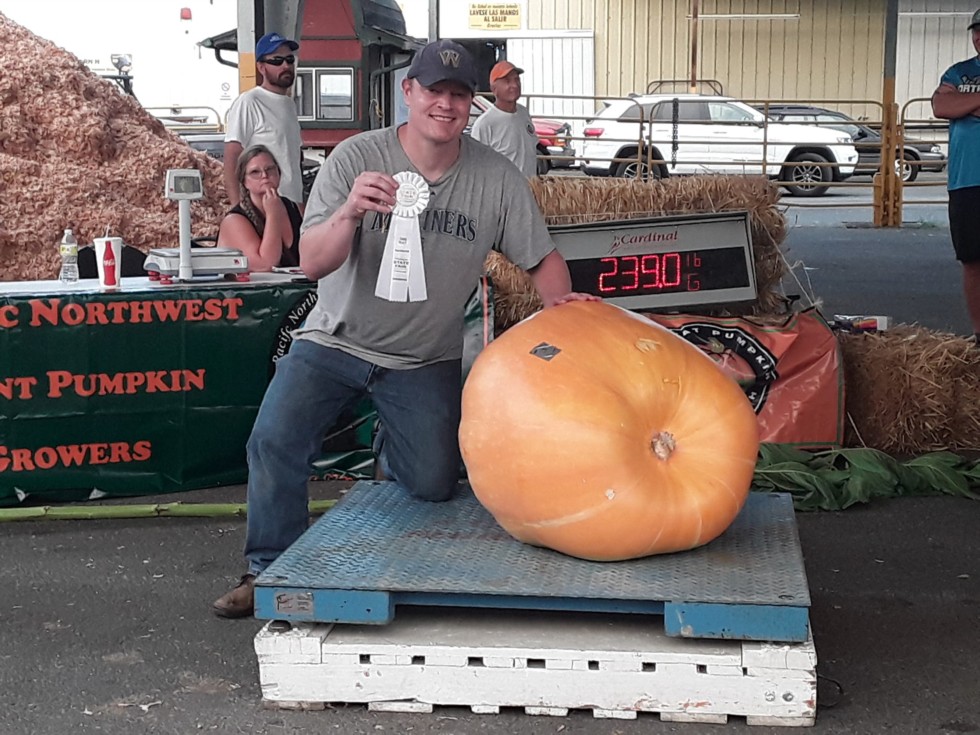 The 1263.5 Montsma at the fair. They taped it estimating at 197# and it came in 21% heavy. It was a low turnout at the fair with only 5 pumpkins showing up. I was able to take 3rd place. I did not win the Howard Dill Award losing to a much larger pumpkin that didn't have great color but had a pretty nice shape with pronounced ribs.
