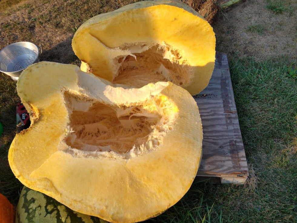Fair pumpkin was starting to go bad on display in the front yard so was time to chunk it up. Pretty thick supporting why it was 10% heavy, which is the lowest % heavy for this seed so far for the ones on pumpkin fanatic. Cross was 1747.5 Handy x 2122 Skinner
