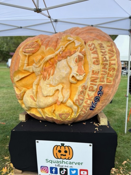 What an honor it was to have my 1693 McMillin�22 that took first place at the Canfield Fair carved by Gus the Squashcarver. Anyone looking to have a pumpkin carved will not be disappointed by his amazing work. He and his family are truly amazing people. Here is a link to the work he did for the 3rd annual Jack Pine Glass and Pumpkin festival in Hocking Hills Ohio, again thanks Gus.