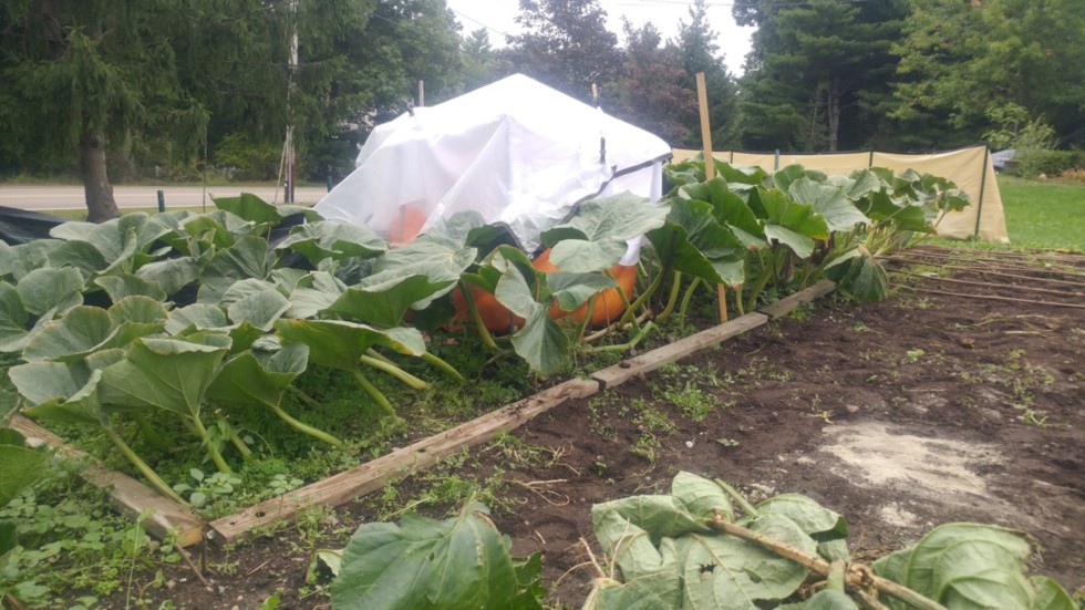 The 150 pumpkin in its small patch is covered with plastic today to keep it dry. Its growing slowly now and is waiting till Sept 29th to harvest for the Topsfield Fair. The neighboring Bushel Gourd plant was pulled out to get the fruit we enter the Durham Fair