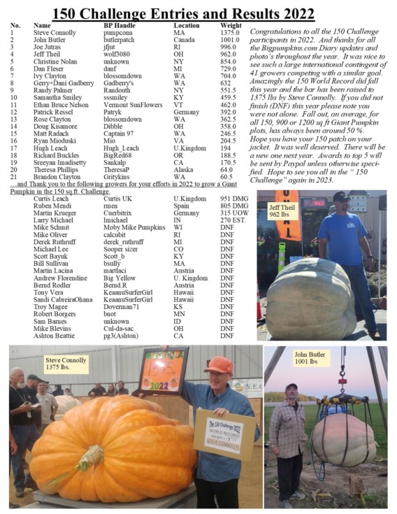 Here are the Final results of the 150 Challenge for 2022. Congrats to all the Growers shown who took on this Challenge. Its not as easy as it may seem but now many more of us are familiar with growing Giants in small spaces. Awards are being sent via Paypal to the top 5 finishers as promised in the Flyer sent out in the Spring. We look forward to seeing you in the "150" 2023.