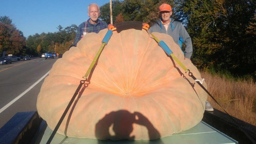 My "150" pumpkin is loaded on the Trailer for Topsfield tomorrow. So Bill Sullivan and I decided to unhitch the Trailer and drive 80 miles up to the Deerfield, NH Weigh-off and see the Geddes Pumpkin get weighed. Took this picture, with Steve Geddes, when we got there, and we joined the caravan of 20 Giant pumpkins, lined up on the highway, to go to Deerfield. It sure looks massive. Cant wait to see what she weigh's, later tonight.