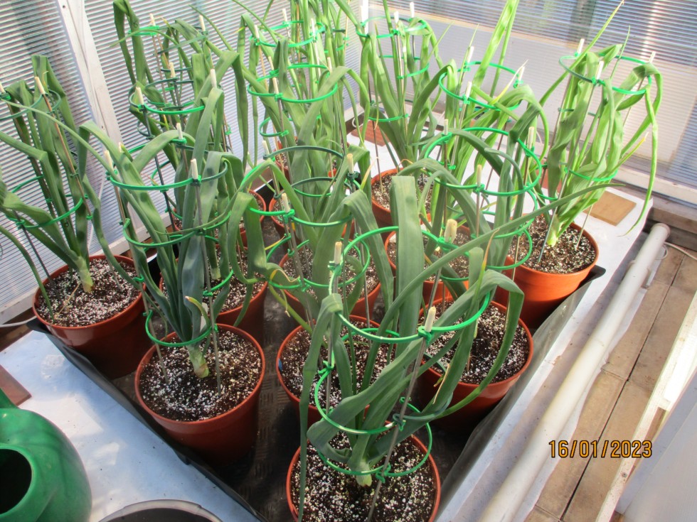 Moved my remaining Onions into 2nd greenhouse enclosure after potting on into 9 inch of Coir/perlite 70/30 mix. 9 leaves on the onions.