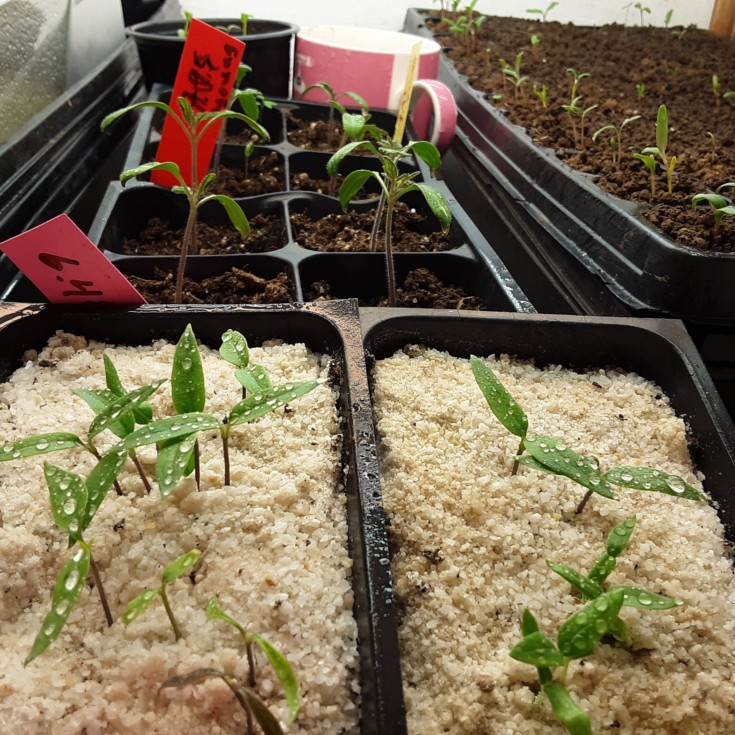 I spread the coarse dolomite directly onto these pepper seeds, about 1/4 inch so that there would be enough weight on the seeds that they could pull the seed coats off. Thought the high ph might kill them but it worked great. Proves the coarse dolomite isnt too chemically harsh. They look like they are doing well in their miniature "white sands national monument" lol. Peppers are touchy seedlings-- its easy to mess them up especially with overwatering.