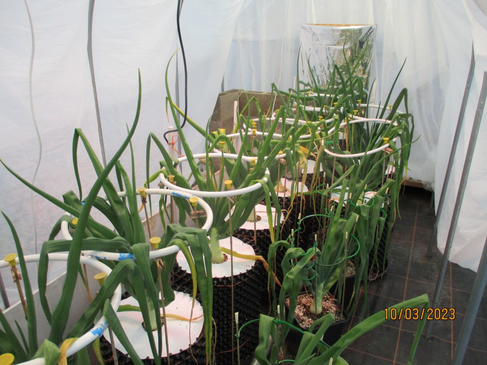 Inside the onions are being kept warm under a thick fleece inner tunnel cover + electric heating/lights.