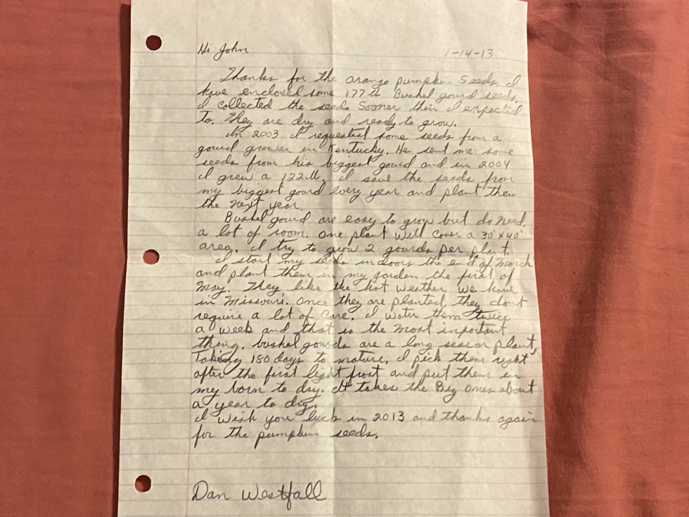 At the gpc convention in Danvers I spoke with Doug English. He told me that Dan westfall had passed away. Dan was a pioneer with the bushel gourds as well as other giant vegetables. I believe all of our current bg genetics have some 177 westfall lineage in them. I thought it might be important for history�s sake to post the letter he sent me in regards to his 177 and it�s roots. So here it is. Kids��. His handwriting is in cursive I will translate if needed lol. Honestly this i is s the nicest cursive I have ever seen. Dan�s bp handle was dirty Dan.