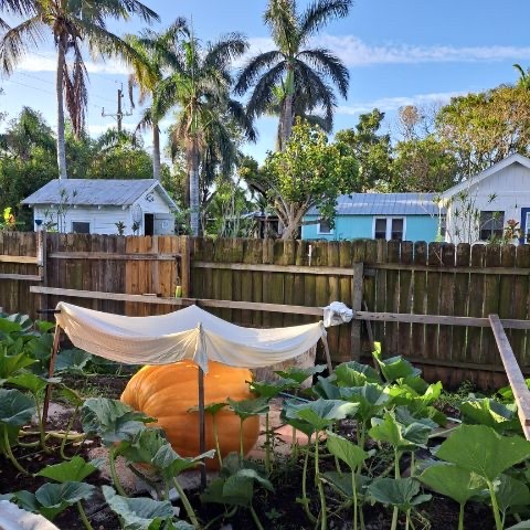 Now there is a rare sight. A beautiful Pumpkin growing with Palm Trees in the background. Hello there Sunshine ! Where is the Corona, Tim?