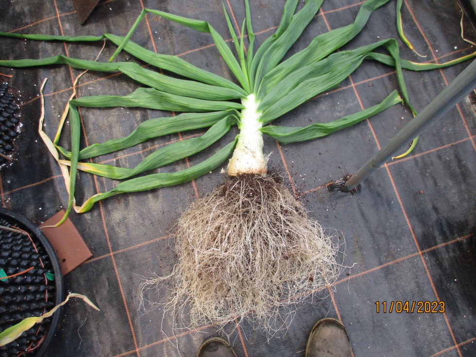 The double onion had a wonderful root structure so that was not the problem and the coir compost was evenly moisture. It measured 12.6 inch circ. x 9 inch high. (always the early largest ones which double? )