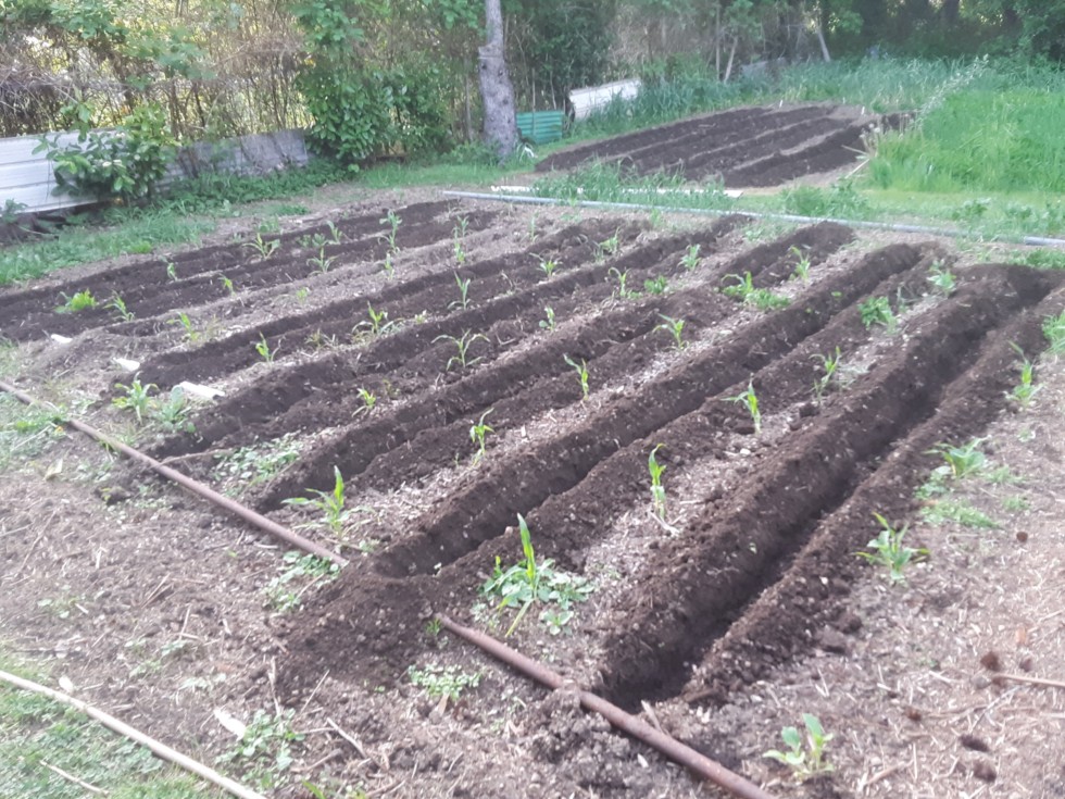 Corn with potatoes in between. Unlike the three sisters planting combination, which I've never seen work, this combo will actually work. Potatoes and garlic will work also. Carrots and lettuce in the smaller area in back.