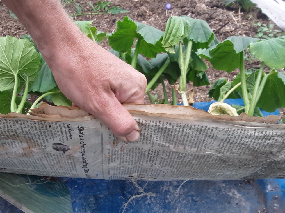 The last tray test. After a month or so a couple roots penetrated the newspaper. Cardboard would work also. If either method could be made concave up then excess water could drain away easier. A sand or compost layer for good drainage might be worthwhile too.