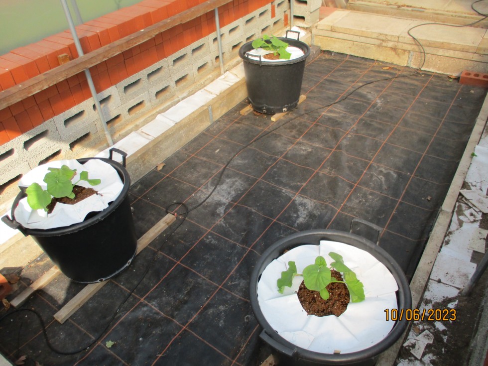 Cantaloupe Melons in side small tunnel, hope this will keep them warmer - no problem today as 30c+ outside.