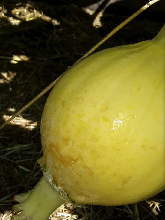 I still can't believe how much damage this pumpkin sustained, my guess is still sun damage, but it may have been aggravated by a bit of acidic fertilizer salt, idk. I had a tomato look this miserable after an excessive dusting of elemental sulfer. Possibly urea was the culprit for the pumpkin, not sure the exact when or how of it.