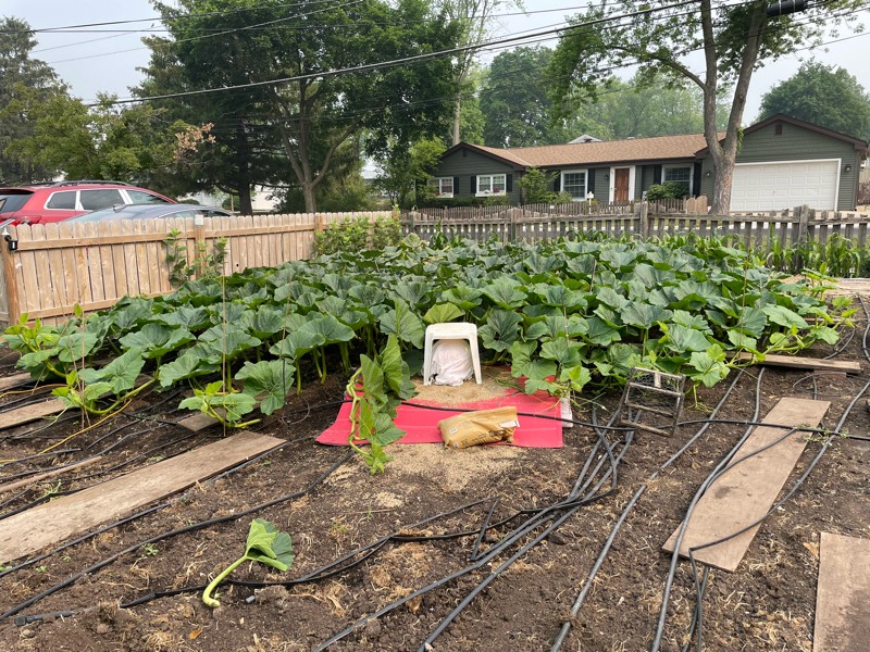 1885 plant is thick and likes to grow straight up. Snaps in the cold and new growth burns if sunny and over 80. Had a few side vines chewed off from an enemy in the patch. The smoke from the wildfires is a nice shade I guess.