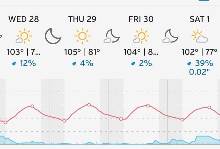 In the middle of a high pressure heat dome. Watering half an inch every day to help mitigate damage. Some secondary leaves that are running outside of the shade cloth shadow are hurting. Relief from the extreme temps starts Sunday.