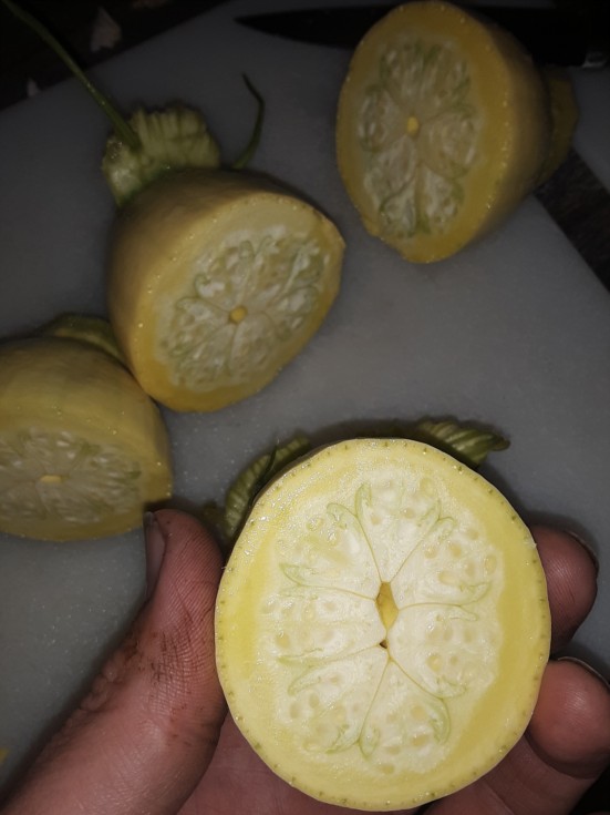 Seven ovaries, 13 rib segments. These two were both on secondaries. In theory they should yield a 30% larger pumpkin. A normal pumpkin would have 10 rib segments.