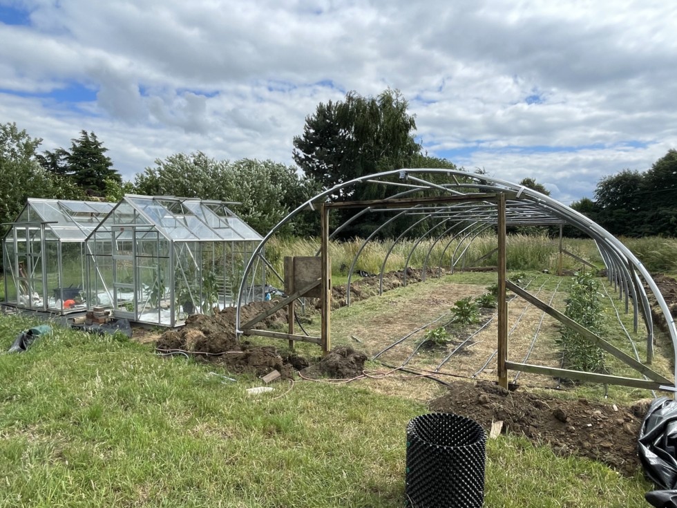 It�s been a struggle to get to this point now in July; but we�re here. Tree cutting required planning which took months. Irrigation lines laid in from the house so the plot has water, two smaller greenhouses up and a 50 ft polytunnel. Playing catch up, I had transplants ready before the structures - so they went into the ground months before and then structures were built around them. Instead of agonising over if my plants have x, y and other pampering - time is being spend trying to get basics done. Water. Roof. Soil tests (but not amended yet)