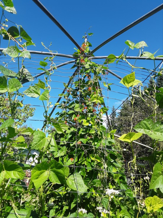 Star of the week goes to the beans... red runner beans they're 14 ft up and interfering with their own overhead sprinkler. I have a bunch of types, they've been an easier crop than I was expecting and they really do require less nitrogen than other crops which is great. But without question the red flowered ones are the most aggressive (so much so that I'll probably segregate them out from the others in the future.)