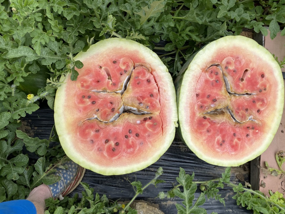 Inside of the stem split melon. This flesh is nice and tight with a ver small hollow heart this would have been nice and heavy to the charts. Too bad
