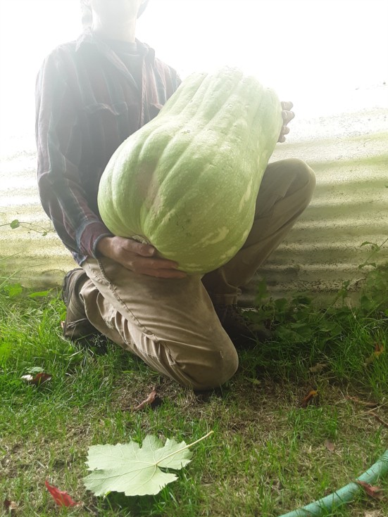 Holding my butternut baby. Stopped growing, harvested today @ 27 DAP/55 lbs, blossom end split... She was a big baby.