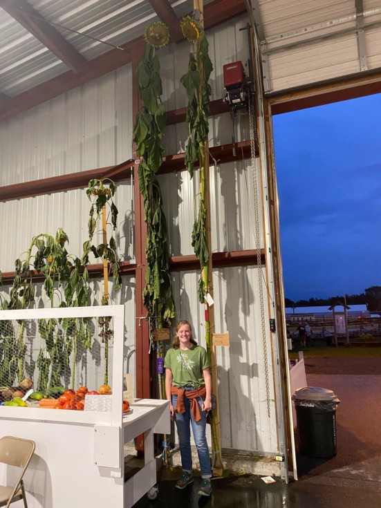 My daughter Emily standing next to her new pb and fair record 18�4� sunflower. The other impressive sunflower is 17�7� grown by sandy eustace
