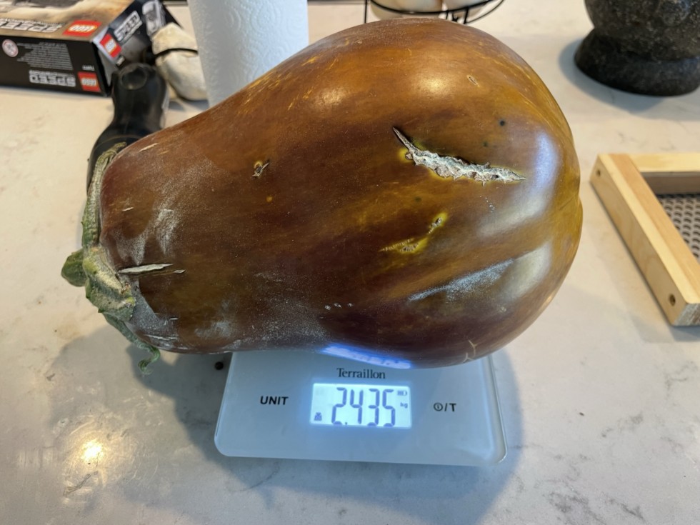 2.435 dmg for the next giant aubergine; has had a skin split for a long time and I thought it might hold, but recently started showing soft rot on the split (imagine current high heat has not helped!)