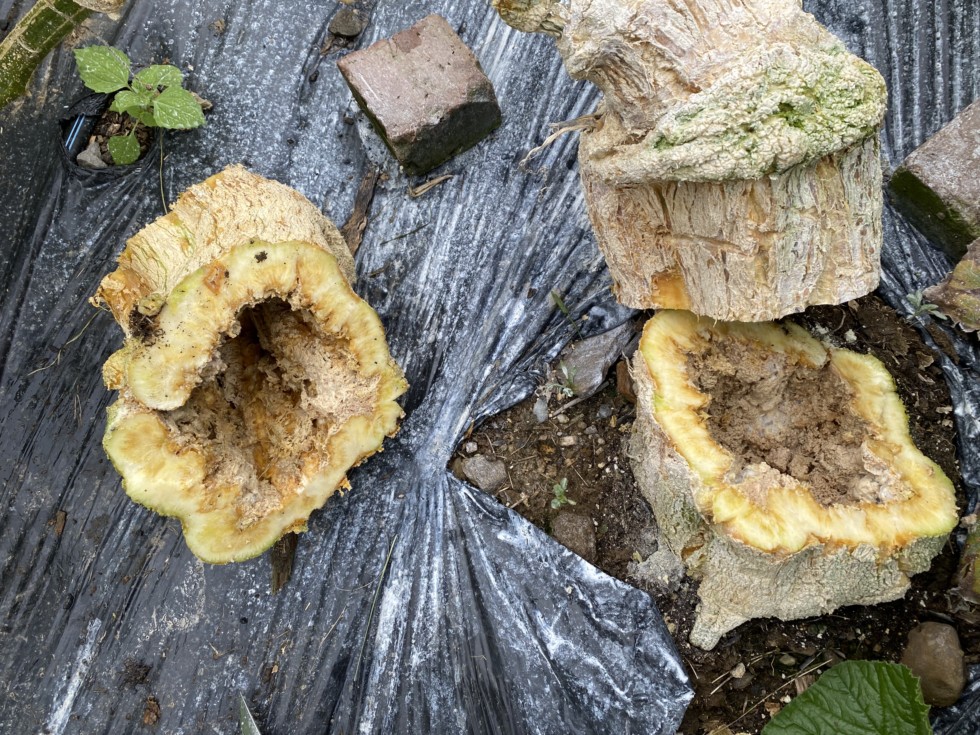 But after consulting with my pumpkin mentor Gary Vincent. He told me �John it�s up to you but you do have to be careful with internal rot traveling up the vine and into the pumpkin�. So after much back and forth in my mind I took the conservative approach and decided to have a look and see what the inside was doing. Sure enough it was rotting.