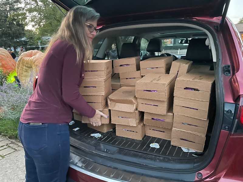 Even with a couple inches of snow on Halloween we still had 500 trick or treaters. Here's part of the cases of candy being unloaded for the little goblins.