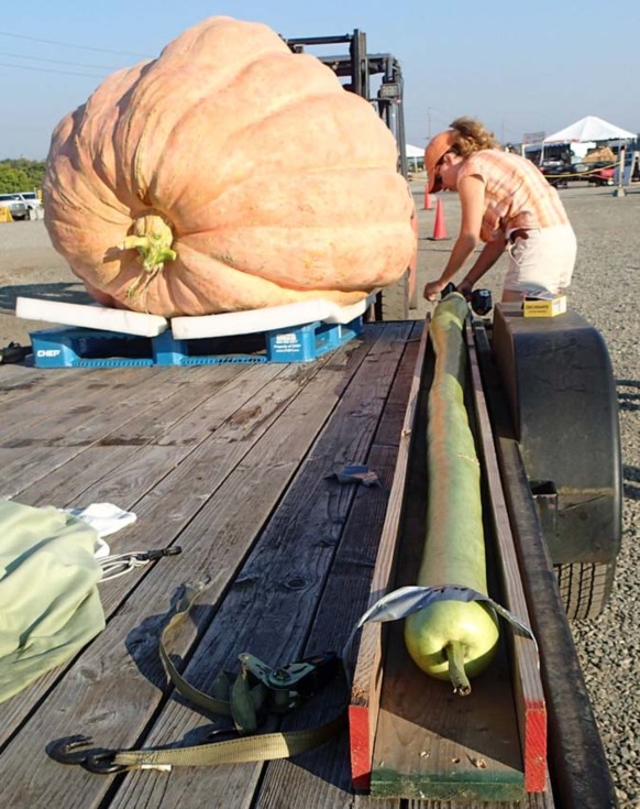 For the GPC Auction, a photo of the 138.13 Tobeck 22 Long Gourd, Washington State Record, and the 1989.5 Tobeck 22, Winner at the Carpinito Brothers Giant Pumpkin WO in Kent, WA.