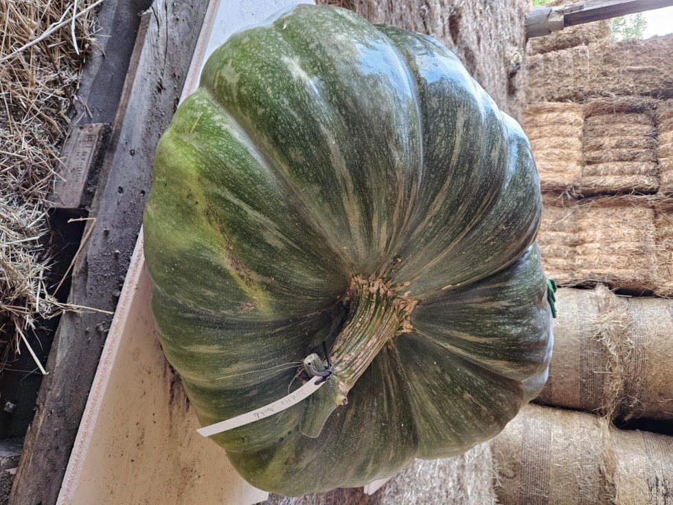 Last year, I grew 2 squash just to make a nice cross. Target was to find a line carrying differents g�nes than the 1109 Jutras. Good shape, heavy, great color and , of course, good size : 1628.5 Sikorski so I planted it , let it grow with almost no cares. I pollinated a nice female on the mainvine with 3 m�les from 1109 Jutras. The plant produced about 7 fruits but , for s�r, I only saved the seeds from the cross I've made. That s a promising cross for the futur. Here a photo.