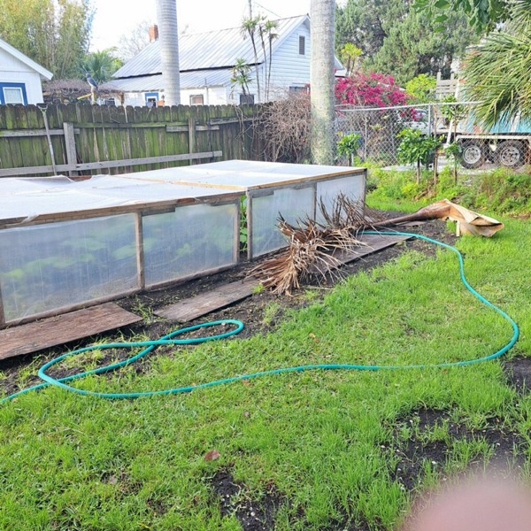 Tim had a close call in his Florida patch. The enclosure was narrowly missed by a queen palm tree branch during a recent rain storm. I can't say I have ever had a close call with a palm tree here in PA. He has a female swelling and should be open in a few days and another baby showing on the tip of the main of the 977 .