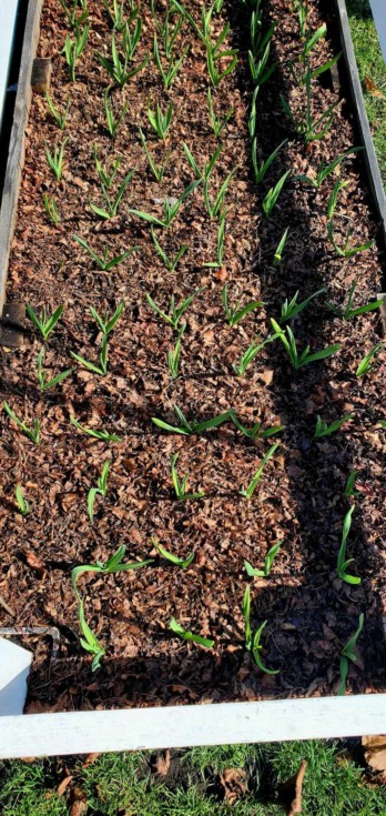 Garlics are about 4 inch tall. Weather has been very warm for this time of the year but we are not out of the woods yet. Heavy frost forecasted for tonight. Need to cover those babies.