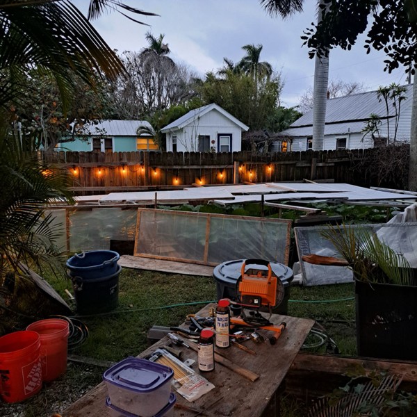 Tim's backyard garden is lit up at night. Looking good Tim. Crack open a cold one and enjoy it.