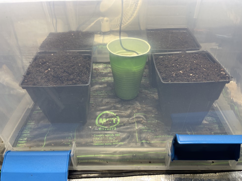 March 23. 0530 am Seeds were placed tip down in small pots in Miracle Grow Seed Starting mix. Heat mat is set on 88 degrees. LED grow light is set at 300 ppfd. Clear plastic tote placed on top to keep the mix from drying out and better control heated environment. -1/8 tsp WOW 5/2. -1/8 tsp Azos. -1/32 tsp DPH. All mixed in 1 gallon of water. -1/4 tsp Wow granular Mycorrhiza was added to starting mix also.